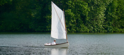 This little 21×7′ hull has a shape that is easy to frame and build, and her light scantlings make for economy of material. Backbone and framing is white oak, planking is cedar or mahogany, screw fastened or copper riveted.