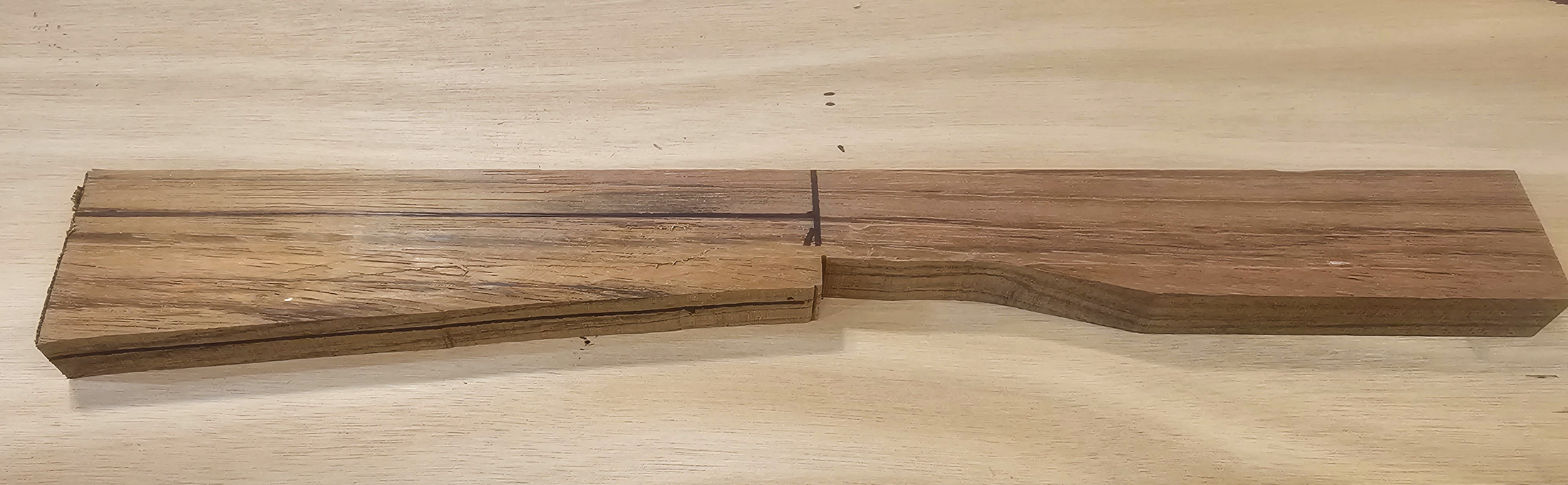 The profile has been cut out, leaving a “handle” on the right, which can be secured in a vise to simplify shaping. The centerline is marked on the bottom edge for reference. The horizontal line at left marks the transition to the taper.