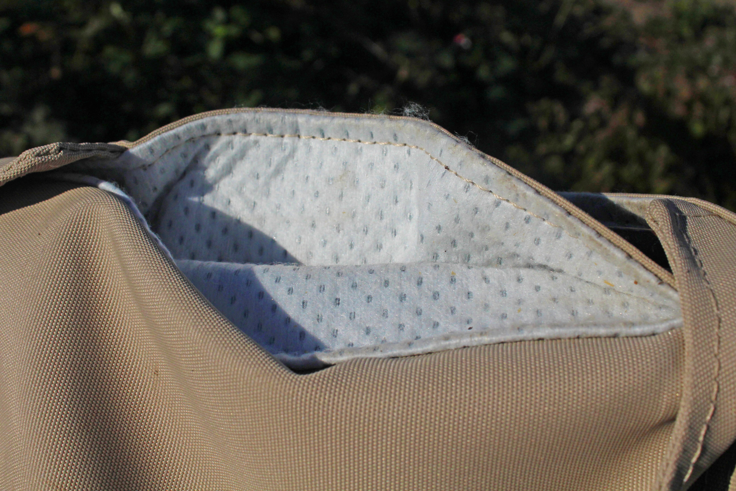 While neither of the fabrics used in the bag’s construction is fully waterproof, they are both highly water resistant. I made a depression in a portion of the bag, pooled water in it, and let it sit for 90 minutes. The outer surface of the bag darkened and felt cool to the touch, indicating water had been absorbed by the fabric’s fibers, but the inner fabric remained dry and warm. If oars are put away wet, the breathability of the two fabrics will allow the bag to dry.