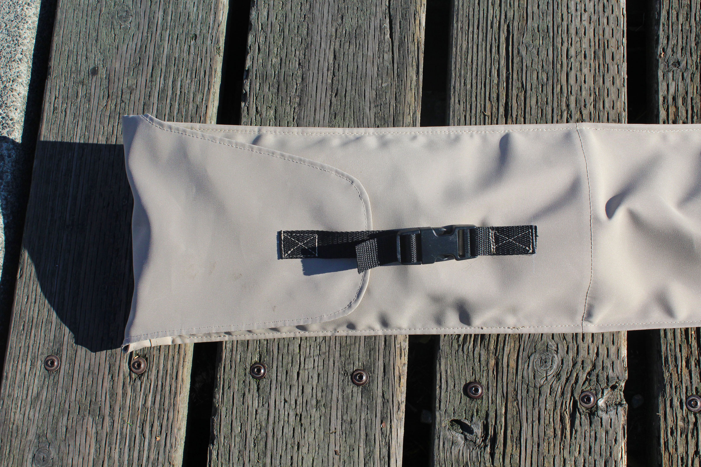 To keep the oars from rubbing against each other and scuffing their varnish, the bag has a full-length divider—polyester on one side, soft non-woven material on the other. A 10″-long flap over the bag’s opening is equipped with a strap and buckle to keep the oars from slipping out.