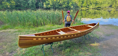 He launched the boat in the summer of 2013 on a small lake near the shop to see how she would row. “At the first stroke of the oars she took off like rabbit,” he said. Later, he took her out for a first sail. “She stood up to the wind, rain, and chop. She stayed dry for the most part and was a pleasure to sail—a dream come true.” The boat still awaits a christening, a name, and an owner. Joe is now working on a Rushton wooden canoe, a project that is much more manageable and less expensive.![]()