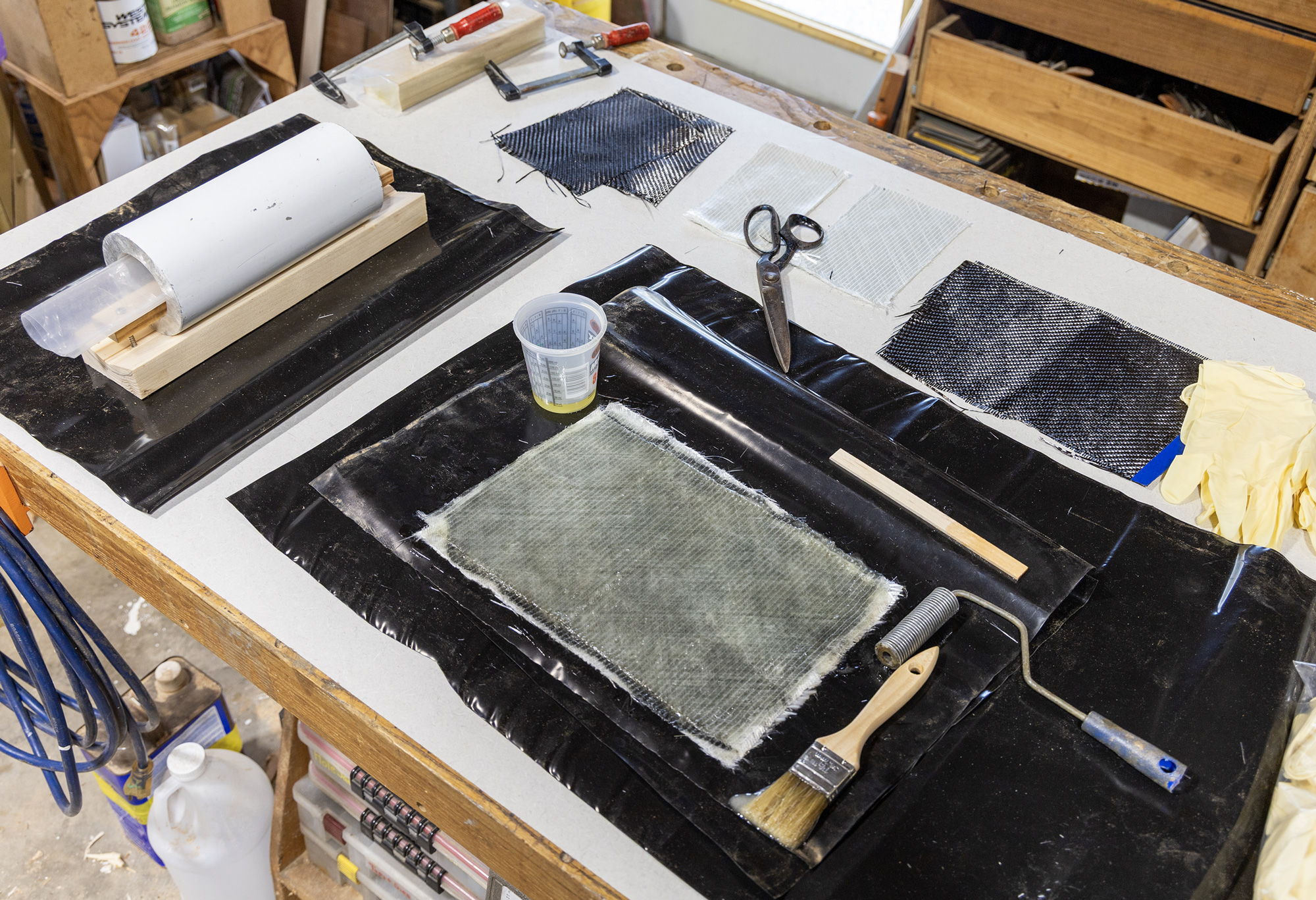 Photographs by the authorHaving an organized workspace is key, as is gathering everything you need ahead of time. Here, precut pieces of carbon fiber and fiberglass are being laid on top of each other and saturated with epoxy. As this can be a messy job, I made sure I had several pairs of disposable gloves on hand. To ensure consistent and even spread of the epoxy, I used a disposable paintbrush and ’glass roller. In this layup I’m using both ’glass and cabon fiber—the latter as a top layer for improved appearance.