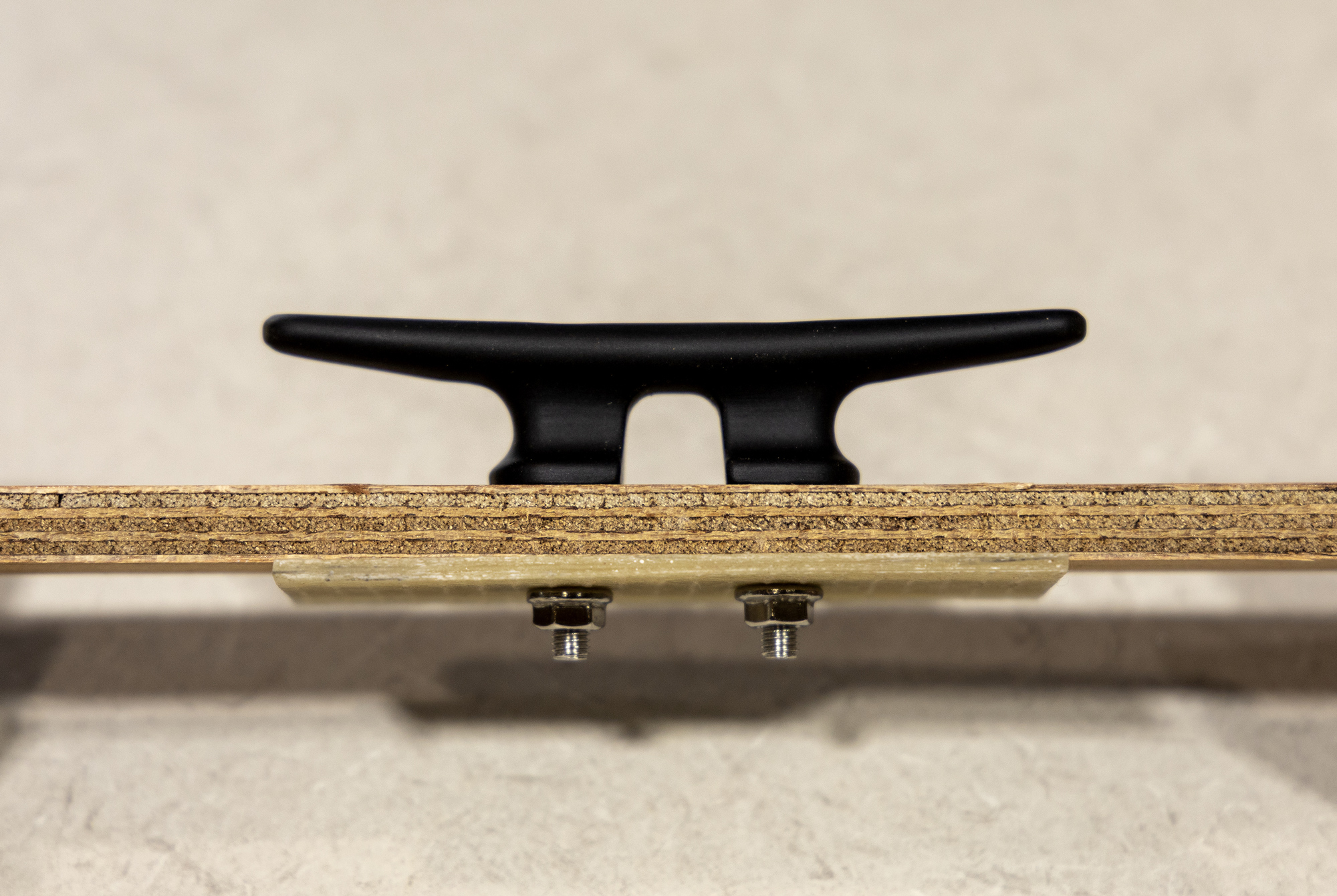 A laminated fiberglass-and-epoxy backing plate spreads the load of a cleat and protects the wood fibers from being crushed by the fastening nuts and washers. When the fitting will be out of sight, I’m less concerned about its appearance and so don’t add the carbon-fiber layer.