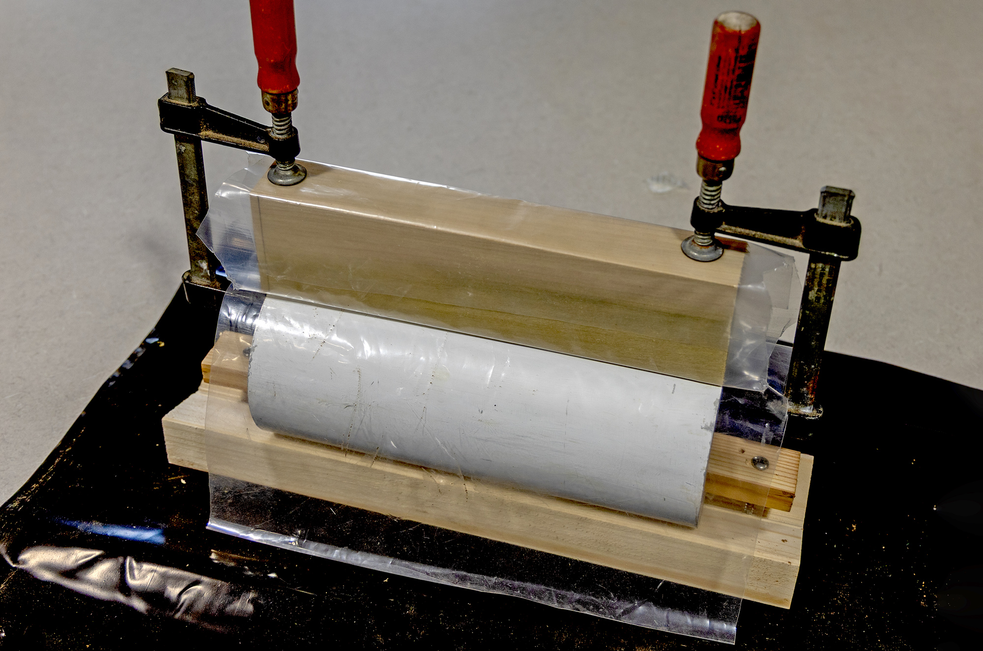 For my gaff-saddle form, I was lucky to have some aluminum pipe that matched the diameter of the mast; for the saddle arms’ spacer I used a block of wood cut to the correct thickness. I separately wrapped the wood and the pipe in plastic to create barriers for the epoxy, and clamped the two forms together to check for placement and stability before proceeding.