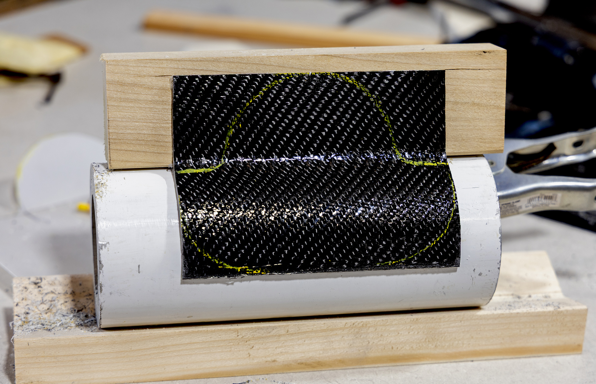 After everything had cured to a leather hardness, I trimmed the edges while the lamination was still on the form—I used a utility knife with a new blade to trim the exposed needles of the carbon-fiber cloth. I also marked out the finished shape of the gaff saddle, but to maintain the curved shape as accurately as possible, I left the lamination on the form to fully cool and cure.