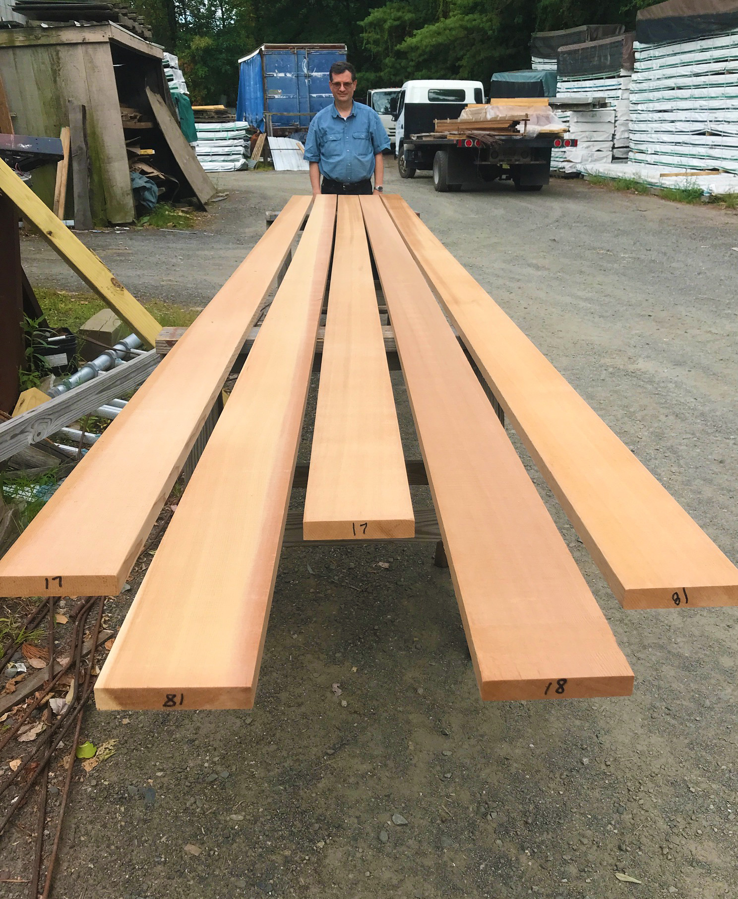 Photographs courtesy of Justine and John DiamondAfter several hours of searching through the stacks at the lumberyard, John (seen here) and Justine had found five beautiful western red cedar boards, which they were able to mill into 72 strips to build the hull of their Bob’s Special.