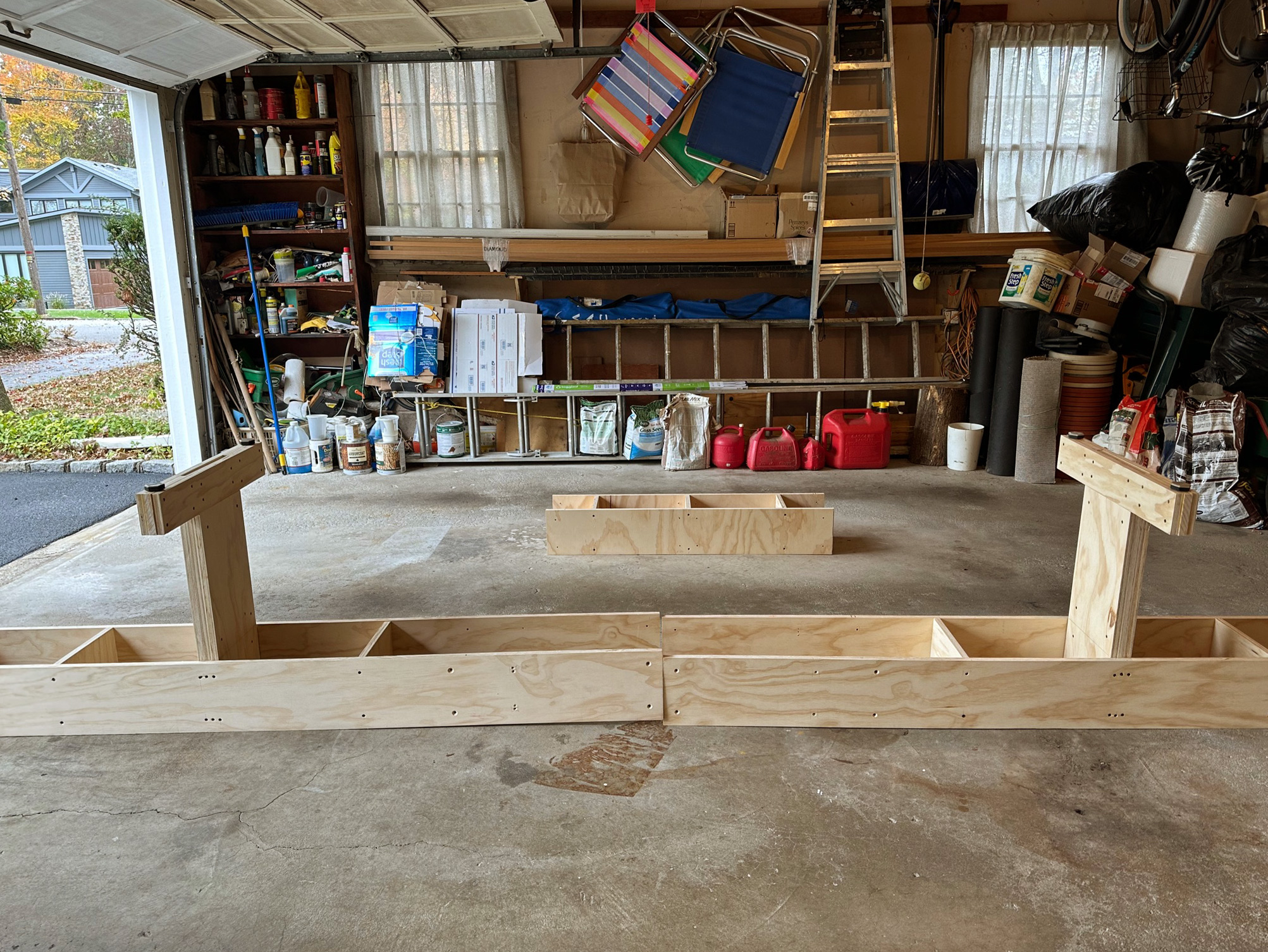 John built the strongback in the basement workshop before he and Justine carried it up the stairs, outside, and around the house to their two-car garage. There they assembled it upside down before turning it over and leveling it.