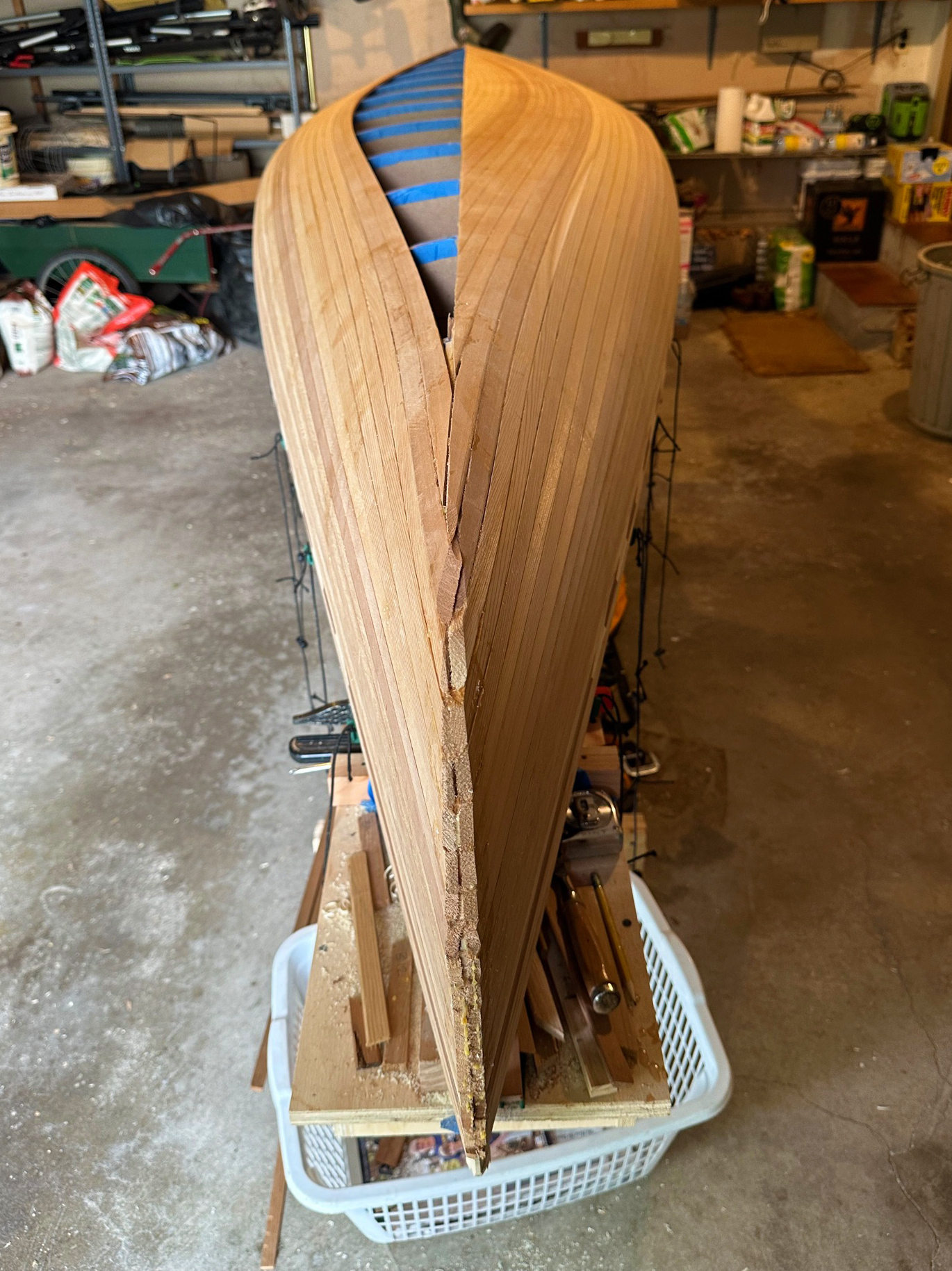 John and Justine decided not to use staples when planking the hull. Instead, each strip was glued to the one below, clamping blocks were placed inside the upper cove to protect its vulnerable edges, and then a bungee cord—attached to a clip—was wrapped around all the laid strips and tightened to apply pressure to the new plank as the glue cured.