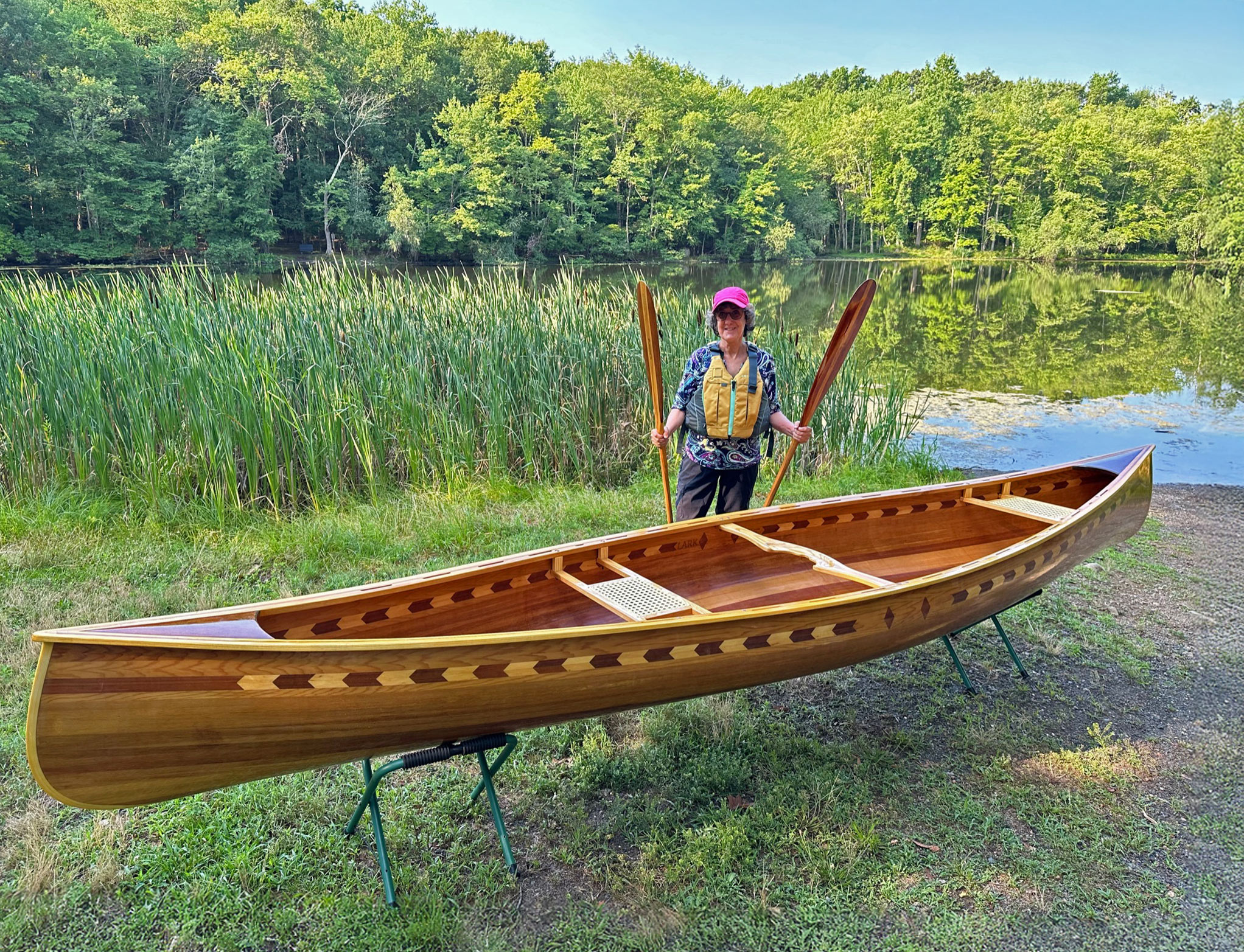 On launching day, Justine stands ready with the beavertail paddles, which John made. The two paddles are identical save in length: Justine’s is roughly an inch shorter to better fit her. The feature strip includes two diamonds, one each for John and Justine Diamond.