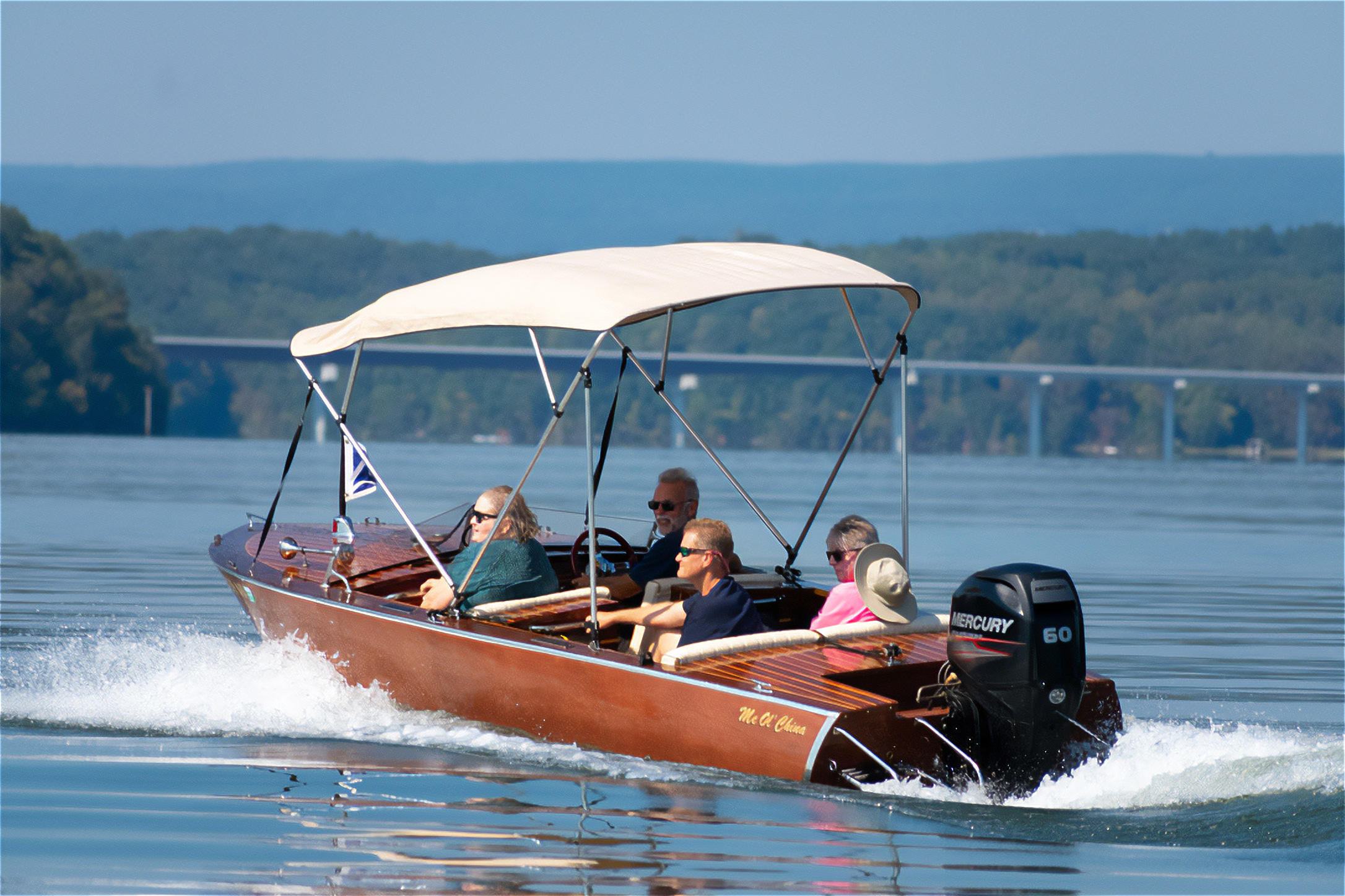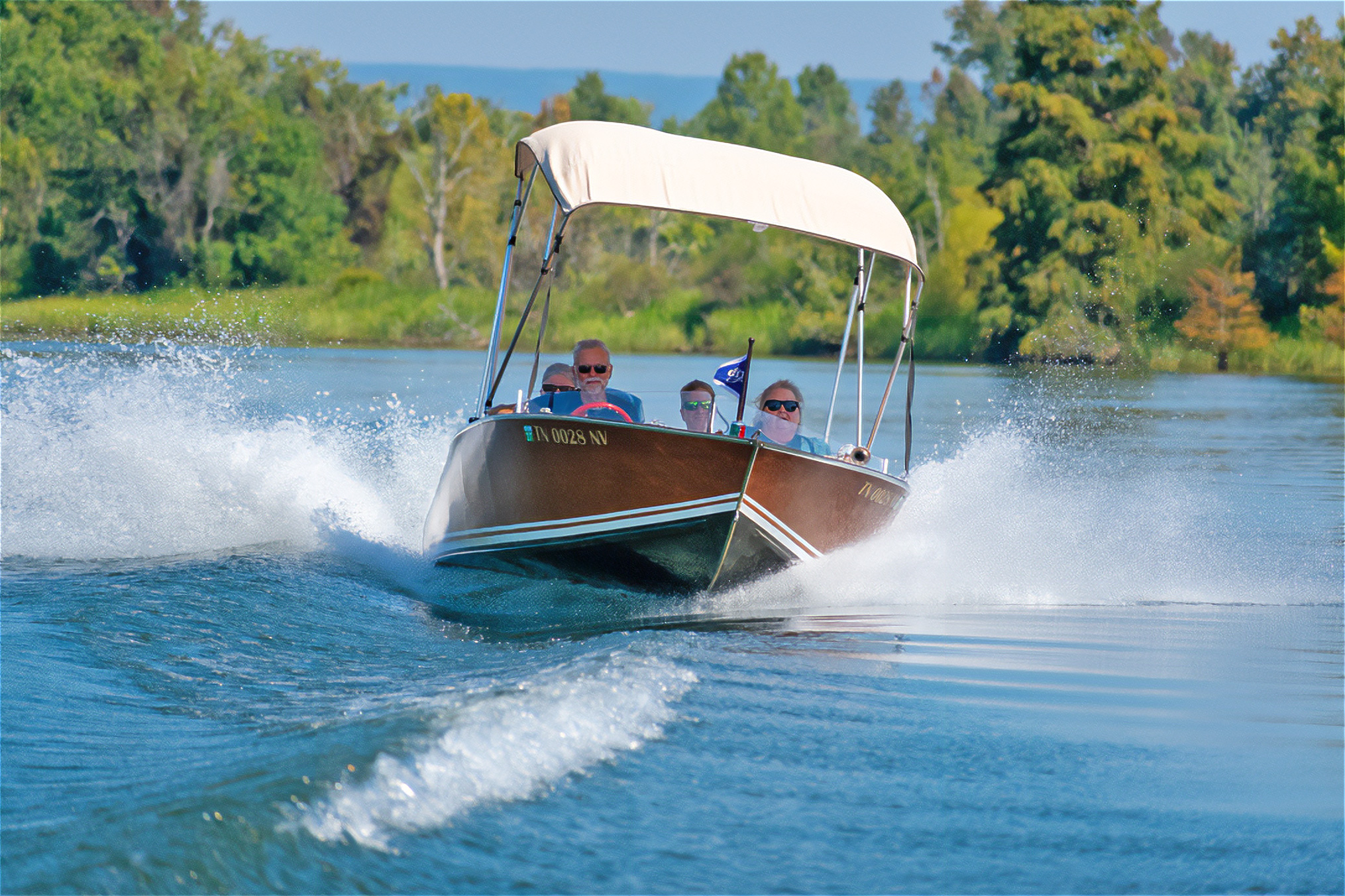 Michael MaddoxFor four adults, the Malahini’s cockpit is spacious. For extra comfort I mounted chrome grab handles in front of each seat. The bimini is not specified by Glen-L, but this production 8′-long, four-hooped version that I found online works well. While the boat is designed to accommodate an 85-hp outboard, the 60-hp motor here provides ample power, though the addition of trim tabs helps the boat to get on plane quicker when there is a full crew on board.