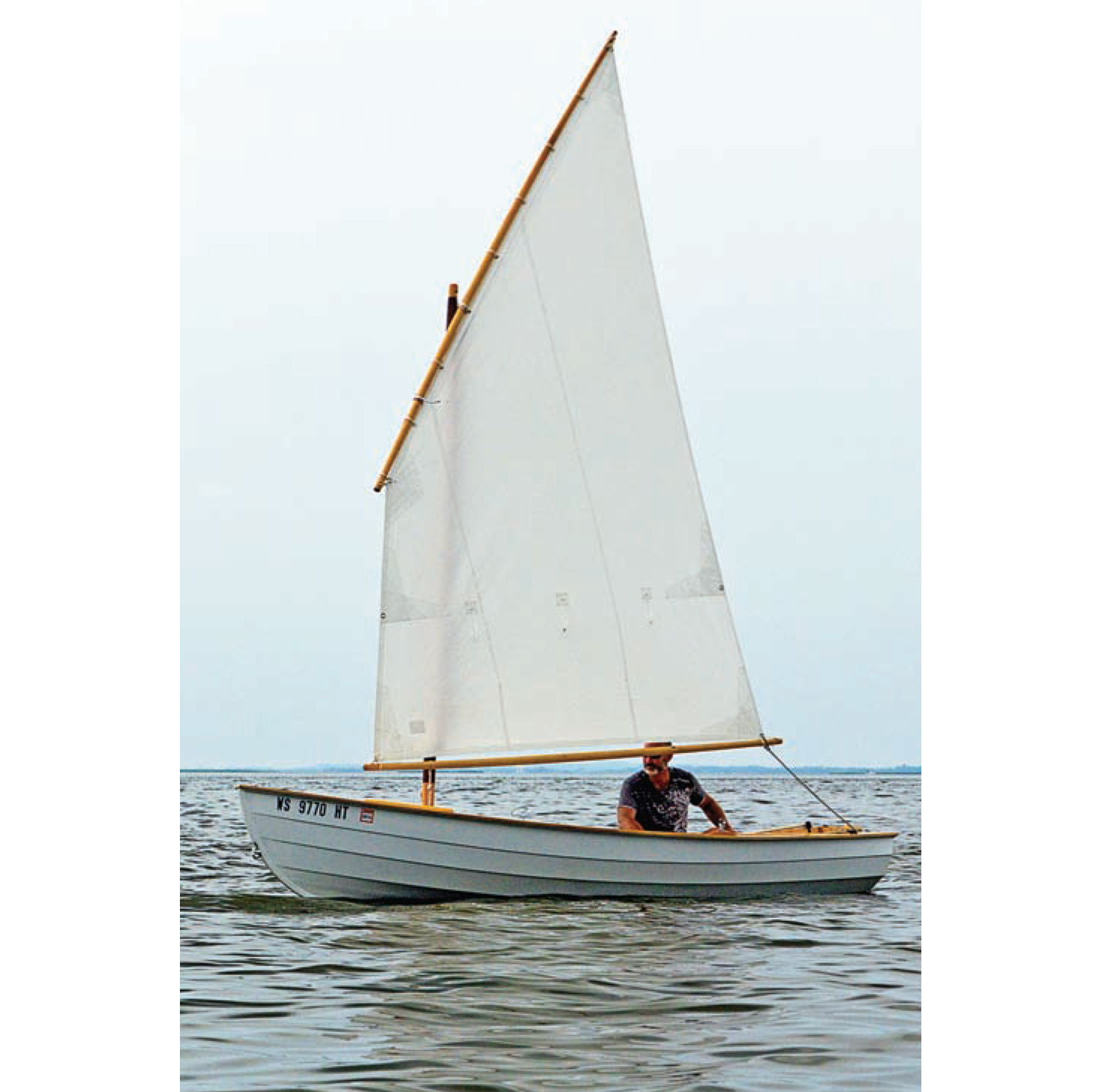 The steering is light and responsive, with just a touch of weather helm. Even in 15–20 knots of wind I can hold the tiller between my thumb and forefinger. Sheeting loads are minimal, too. I run a single-part sheet directly from the boom to my hand. Hooking the line under a horn cleat on the leeward quarter takes the strain off, and the lack of blocks makes for a much shorter sheet—less clutter underfoot, and no frantically reeling in line after each tack. A rope traveler over the tiller is another option. With the boom, the sheeting angle isn’t critical.