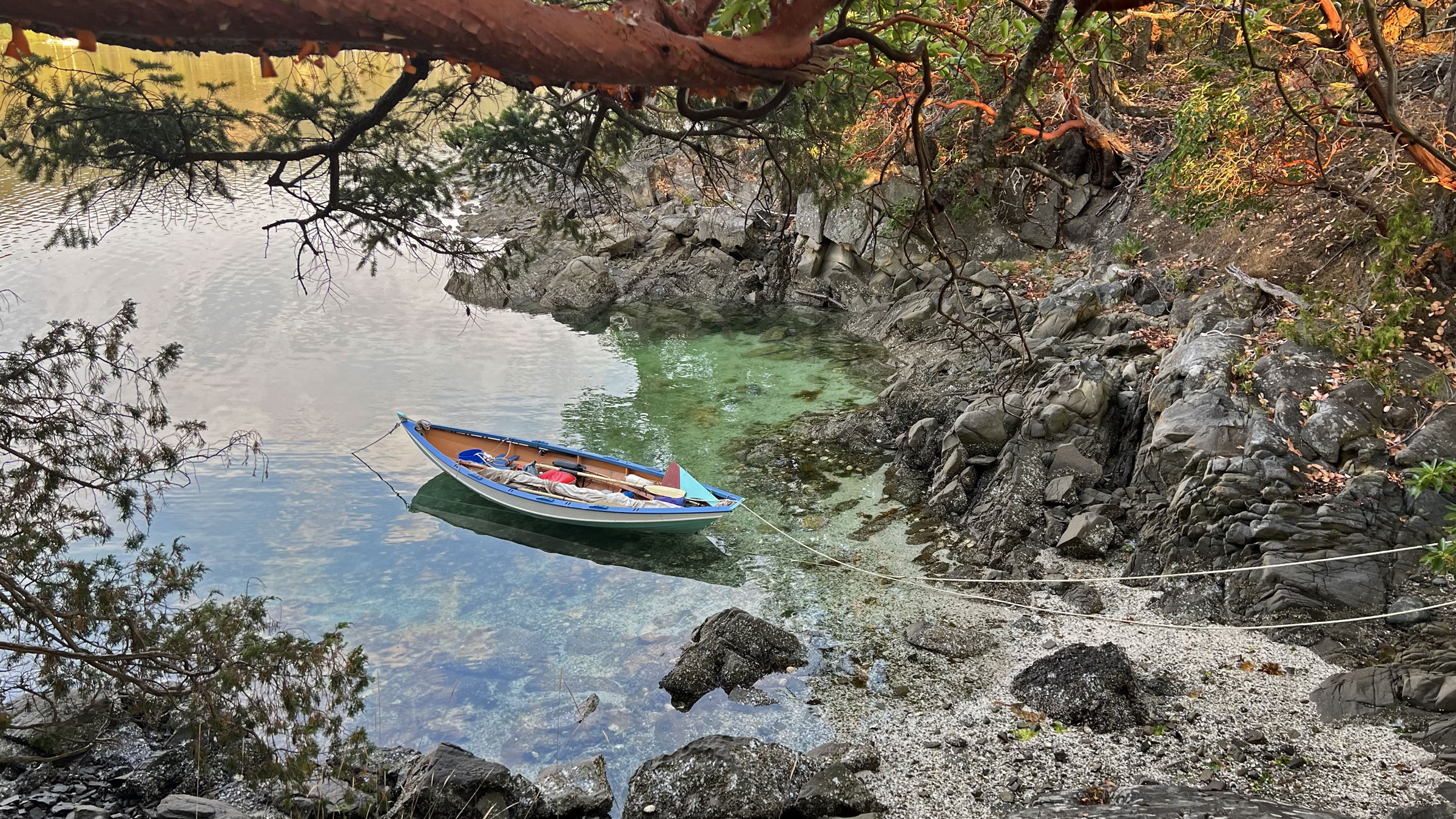 Much of the coastline in the archipelagos of the Salish Sea is rocky. In sheltered areas (such as this marine-trail camp at Point Doughty, Orcas Island) this poses little threat, but in strong winds on the exposed coast of Whidbey Island, a dory could be dashed to pieces.