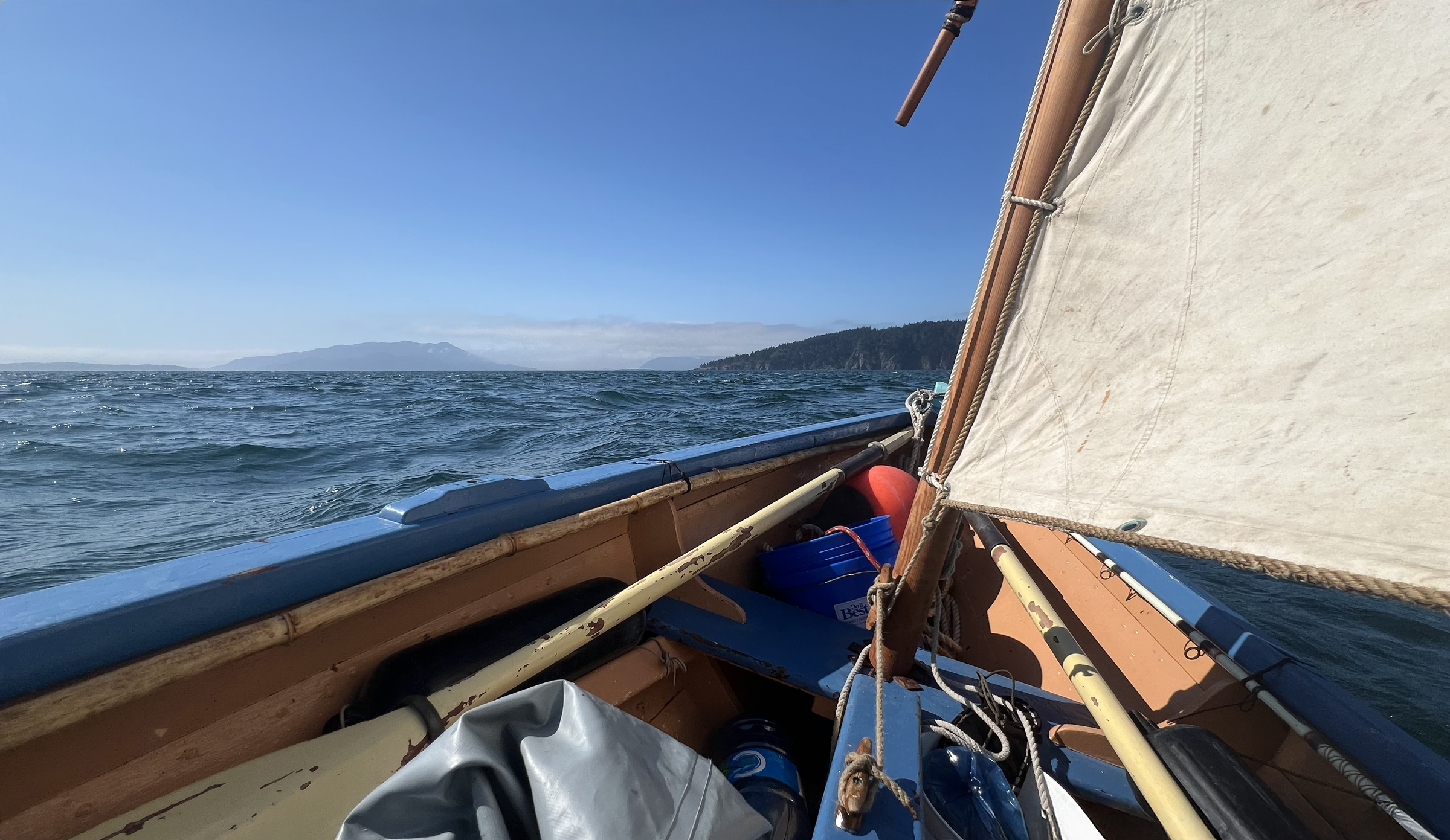 It was one of those rare and perfect July mornings on Port Townsend Bay, Washington, when the waters are so calm you can almost see them ripple when the clocktower strikes its bell. The sun was cresting over the Cascades and glinting golden on the inlet, which was just waking up to the distant sound of moaning outboards, a faint smell of gasoline on the breeze. I had stumbled down to the dock with tired eyes, having stayed up all night packing essentials into drybags, which I now stuffed into every available nook in SOLSTICE, my 17′ Swampscott Dory. She was low in the water when I topped it all off with the bundled sail and mast, and climbed aboard to sit on the thwart and slip the oarlocks into the sockets. The clack of brass on brass brought the gulls to attention; they eyed me sharply and gossiped as I passed them by.