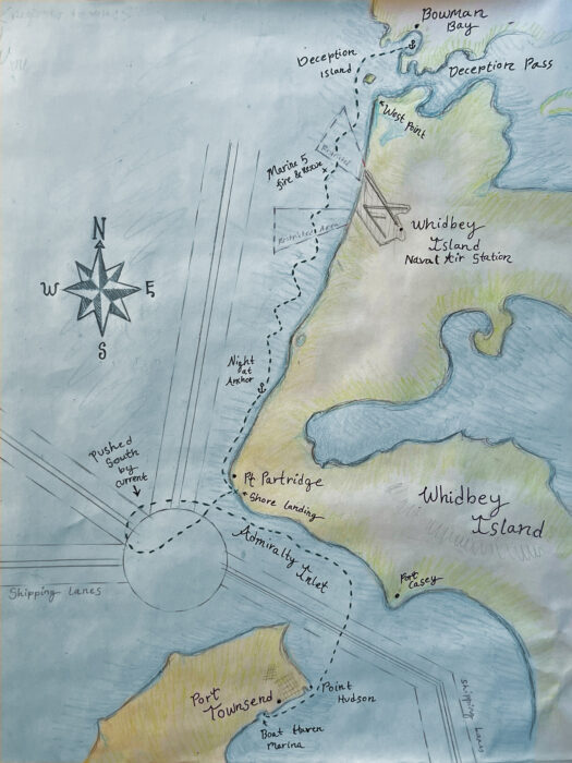 I was glad to have made it through the busy shipping lanes of the Admiralty Inlet but, before I knew it, I was stuck in a powerful current pushing me back toward the passage plied by commercial freighters.