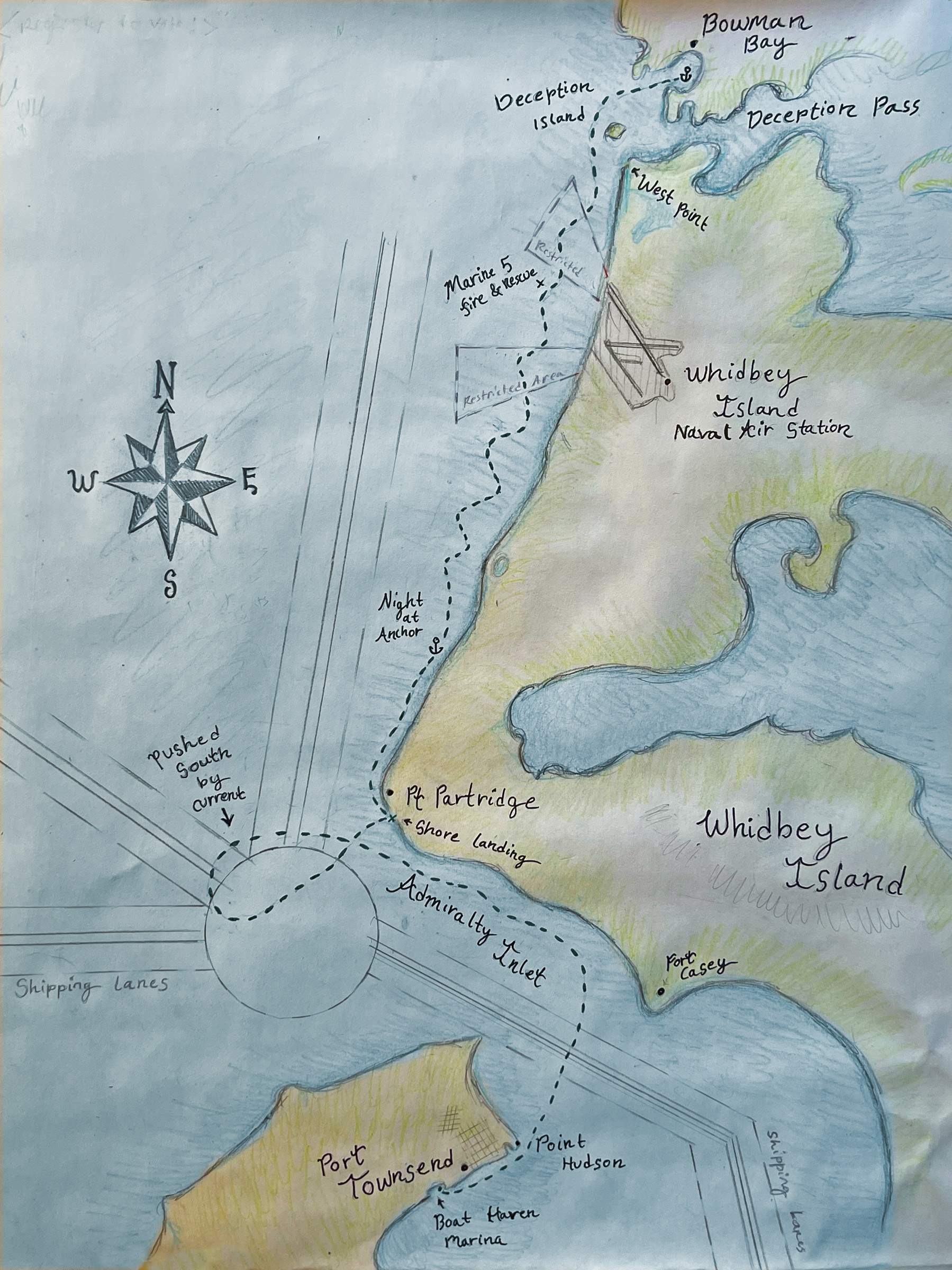 I rowed furiously, checking my progress against Mount Pilchuck in the distance and the clifftop houses in the foreground. There was no time for rest; for every inch I gained rowing, I lost two if I paused for even a moment. I was going nowhere and was baffled, I had planned to ride a narrow band of north-flowing current that cropped up after the transition from ebb to flood tide, but I was being pushed aggressively south; what was going on? I checked my chart and realized with terrifying clarity that I had totally missed the mark and was trapped south of Partridge Bank in a powerful back-eddy. The gathering strength of the flood tide would easily push me into the shipping lanes and back into the hungry mouth of the Admiralty Inlet.